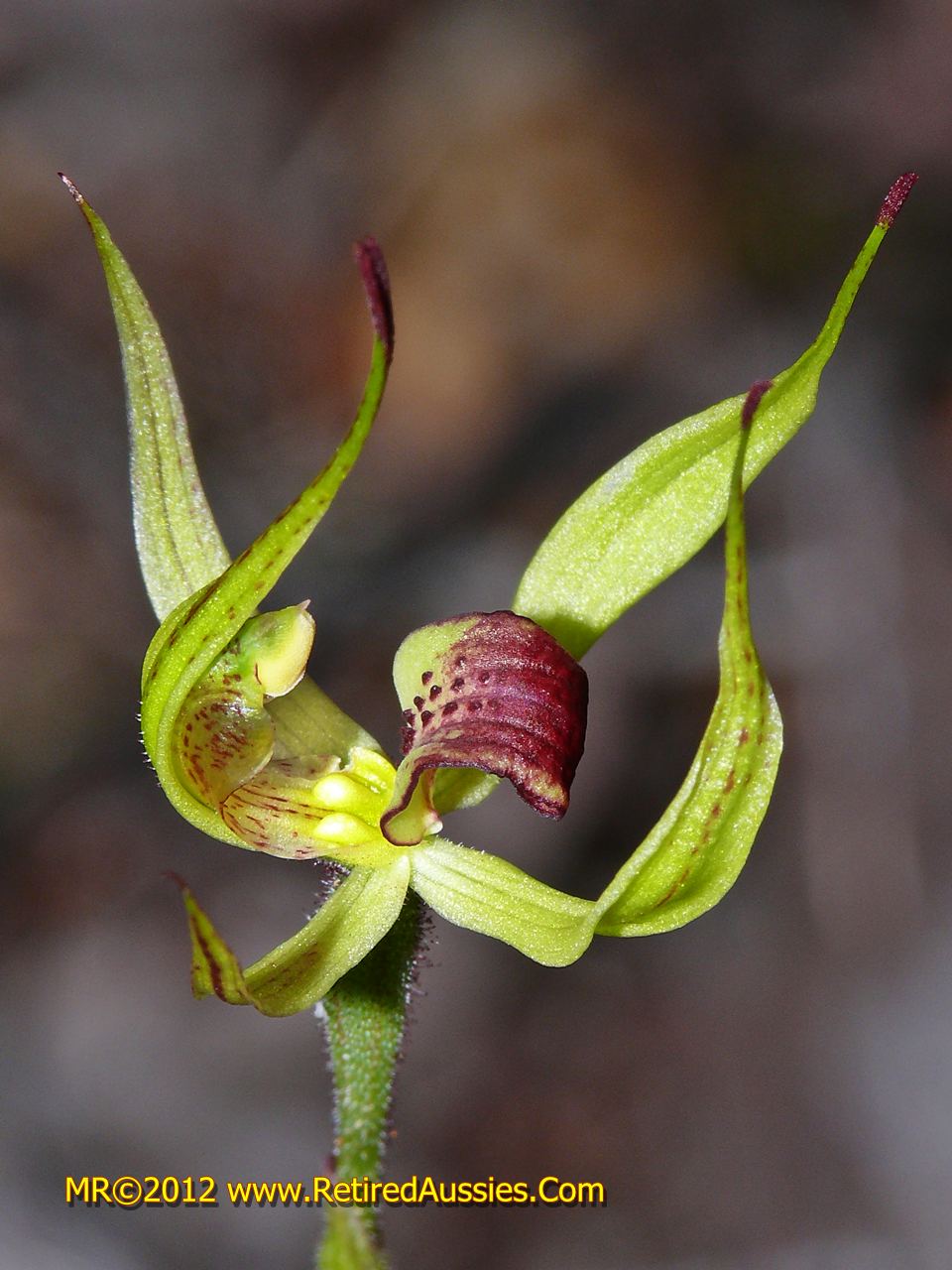 This small to medium sized, cold growing terrestrial species is from South Australia at elevations of 250 to 450 meters in shrubby forests in well drained clay and gravelly soil with a single leaf that blooms in the late winter and spring on an erect, 8 to 18" [20 to 45 cm] long, 1 to 2 flowered inflorescence.