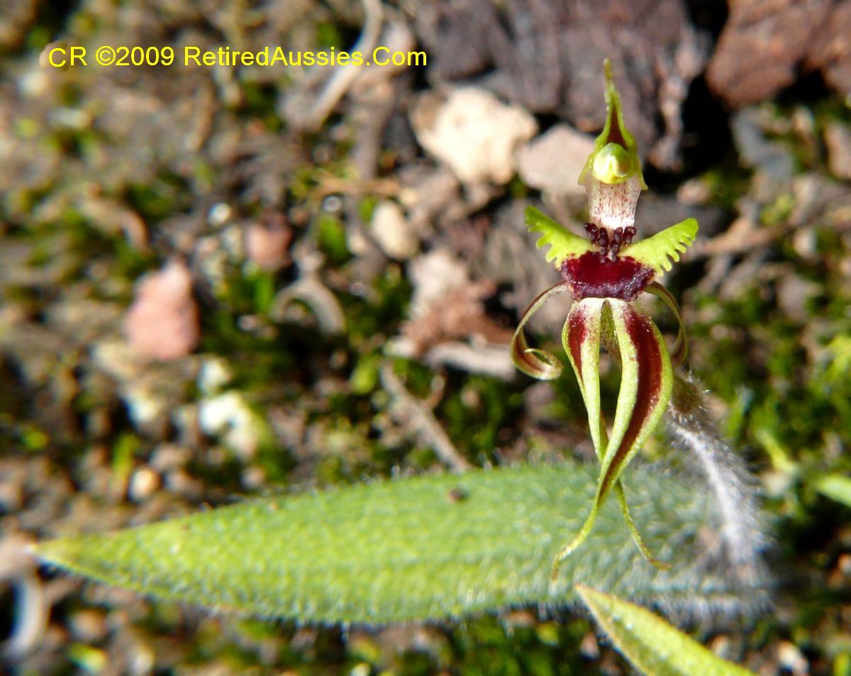Found in Victoria Australia on slopes and ridges in open forests among shrubs and herbs at elevations of 100 to 150 meters as a mini-miniature sized, cold growing terrestrial with a single, linear, pubescent leaf that blooms in the later winter and early spring on an erect, 2.4 to 4" [6 to 10 cm] long, 1 to 2 flowered inflorescence.