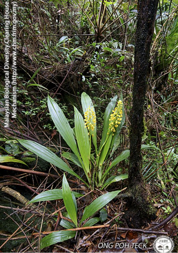 Found in penninsular Malaysia and Sumatra in montane forests at elevations of 1670 to 2000 meters as a large sized, cool growing terrestrial with close set, cylindrical pseudobulbs carrying lanceolate, very acute, narrowing below into the grooved, petiolate base leaves that blooms on a stout, glabrous, peduncle terete, pale green to 10" [25 cm] long, rachis to 4.8" 12 cm] long, densely many flowered inflorescence with some tubular bracts and deciduous, early falling, lanceolate, acuminate, pale green, the lower ones largest floral bracts
