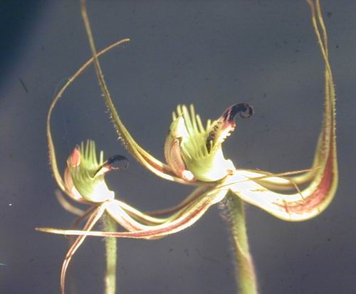 C attingens is on the right in the photo and on the left is the similar C falcata. Found in Western Australia at elevations of 20 to 150 meters in shrubby forests and woodlands and on granite outcrops as a small to medium sized, cold growing terrestrial orchid with a single leaf that blooms in the spring on an erect, [17 to 45 cm] long, 1 to 3 flowered inflorescence.
