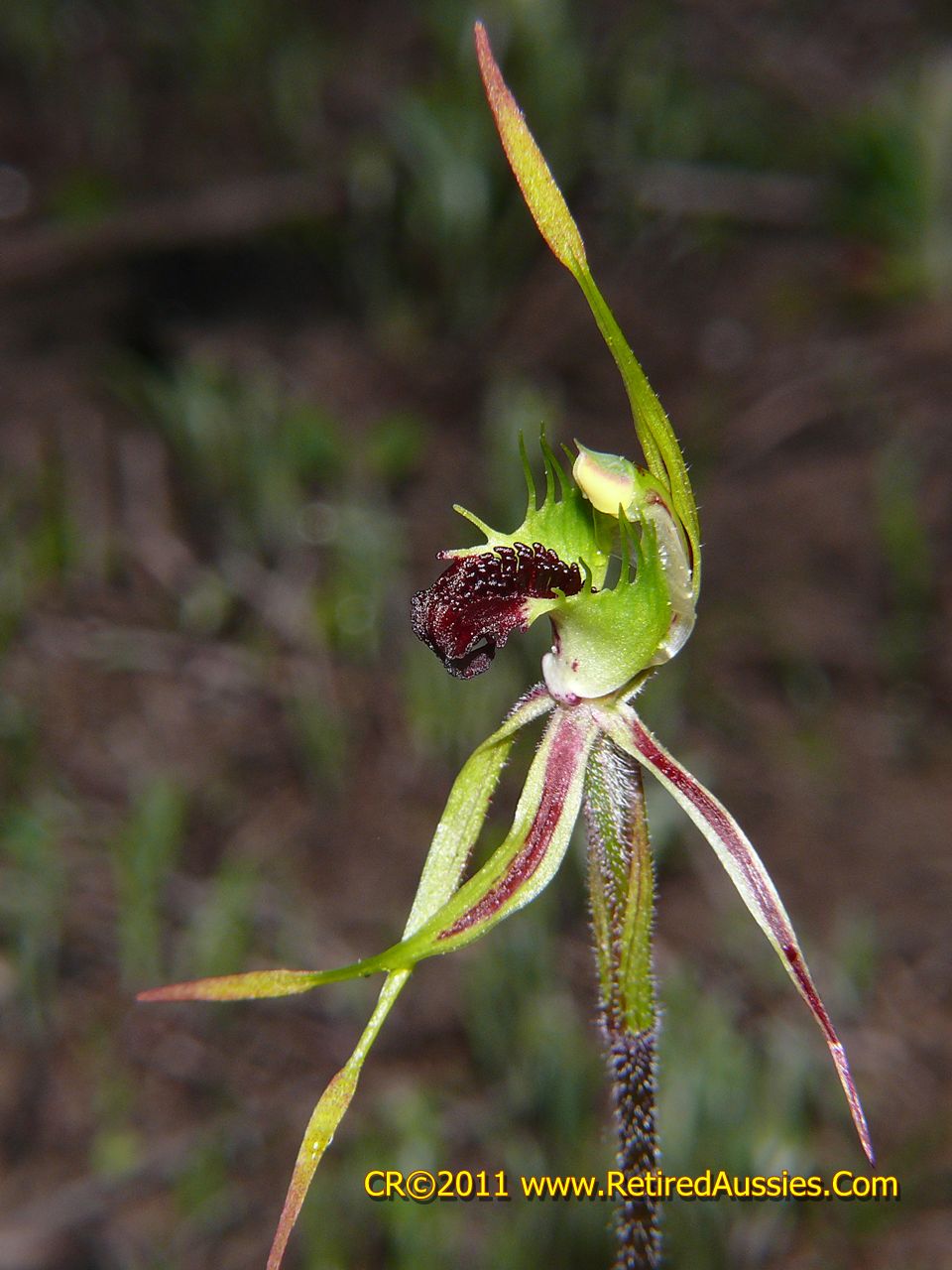 Found in South Australia in small gullies under wattles and shrubs on rocky outcrops at elevations of 300 to 420 meters as a miniature to small sized, cold growing terrestrial with a single, linear, pubescent leaf that blooms in the later winter and early spring on an erect, 4 to 8" [10 to 20 cm] long, single flowered inflorescence.