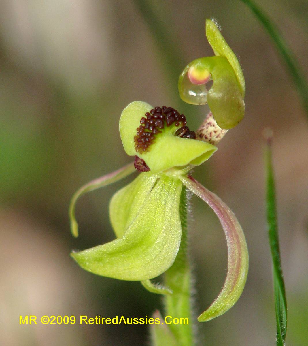 Found in Western Australia in woodlands and shrublands at elevations of 150 to 250 meters as a miniature sized, cold growing terrestrial orchid with a single leaf that blooms in the late winter and spring on an erect, 1.2 to 4" [3 to 10 cm] long, 1 to 2 flowered inflorescence. This is the smallest member of the genus and as such is difficult to locate..