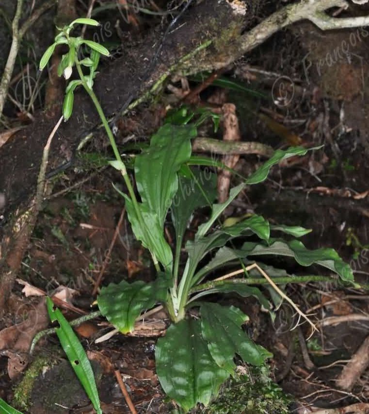 Found in Reunion at elevations of 600 to 1400 meters as a small to medium sized, warm to cool growing terrestrial with elliptic, undulate, plicate, acute, gradually narrowing below into the elongate, petiolate base leaves that blooms in the late summer and earlier fall on a basal, erect, 9.6" [24 cm] long, several flowered inflorescence