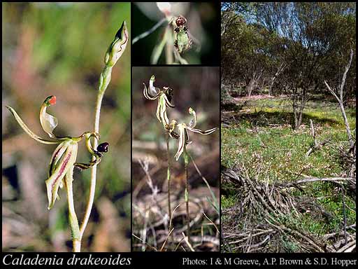 Caladenia drakeoides Hopper & A.P.Br. 2001 SUBGENUS CDrakonorchis © Photography by I & M Greeve, A P Brown, S D Hopper . Image used with the permission of the Western Australian Herbarium, Department of Environment and Conservation (http://florabase.dec.wa.gov.au/help/copyright). Accessed on Thursday, 30 August 2012 and The Flora Base Website
