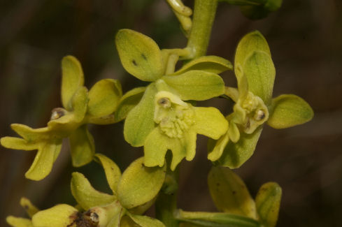 Found in Papua New Guinea at sea level in forests small to medium sized, hot growing terrestrial with clustered pseudobulbs carrying 3, lanceolate, gradually long acuminate, acute, glabrous above, minutely pubescent beneath, yellow blotched, gradually narrowing below into the channeled petiolate base leaves that blooms in the later spring on an erect, much longer than the leaves, peduncle puberulous, with a few sterile sheathing bracts, rachis, pubescent 8 to 13.2" [20 to 33 cm] long, laxly many flowered inflorescence with persistent, lanceolate-triangular, gradually narrowing floral bracts.