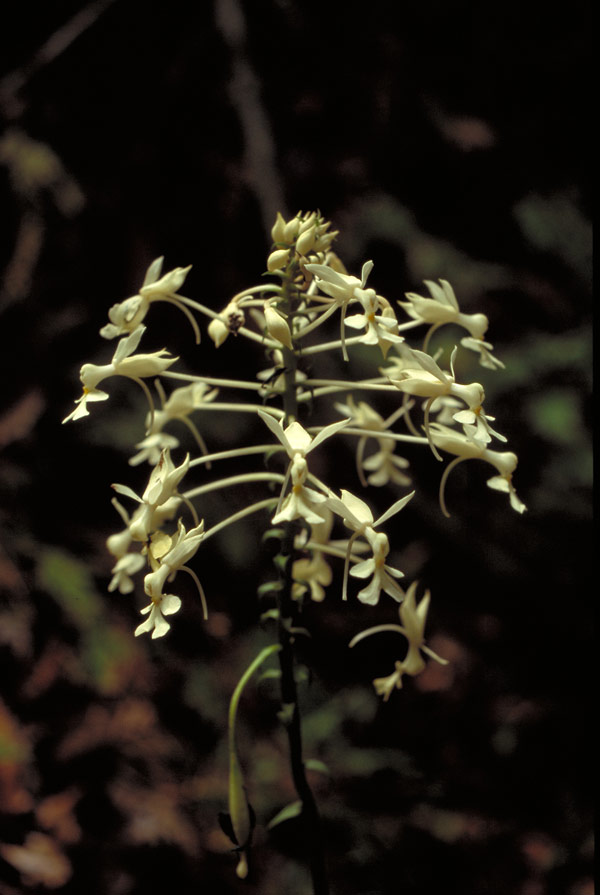 Found in Borneo in lower montane forests at elevations of 200 to 1000 meters as a small sized, hot to warm growing terrestrial with clustered, small pseudobulbs carrying plicate, 5 main nerved, elliptic-oblanceolate, abruptly acuminate, gradually narrowing below into the petiolate base leaves that blooms in the mid winter through later spring and again in the later summer through mid fall on an erect, peduncle to 34" [85 cm] long, 3 sheathing bracts widely spaced, rachis pubescent, to 1.2 to 4.8" [3 to 12 cm] long, overall to 35.2 to 42.8" [88 to 97 cm] long, many flowered inflorescence with persistent, ovate-lanceolate, acuminate floral bracts.
