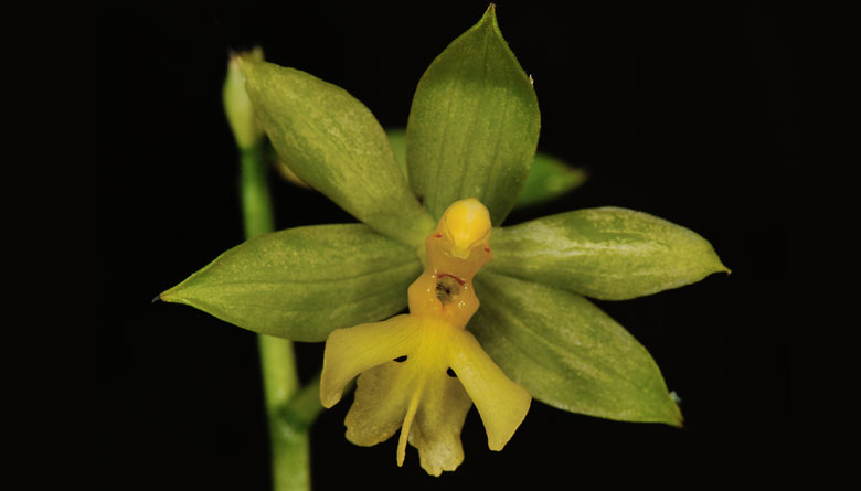 Found in Nepal, Bhutan, India, Yunnan and southeastern Xizhang provinces of China and Myanmar in evergreen broadleaved forests on wet banks in shady, moist locations at elevations of 1500 to 3000 meters as a medium sized, cool to cold growing terrestrial with conic pseudobulbs carrying 3 to 4, well developed at blooming, plicate, oblong or oblong-lanceolate, acute, contracting below into the cuneate, pseudostem base leaves that blooms in the spring through early fall on a terminal, stout, erect, densely pubescent, rachis to 7.6" [19 cm] long, overall to 66" [to 75 cm] long, sparsely many flowered inflorescence with ovate-lanceolate, acuminate, abaxial surface sparsely pubescent floral bracts