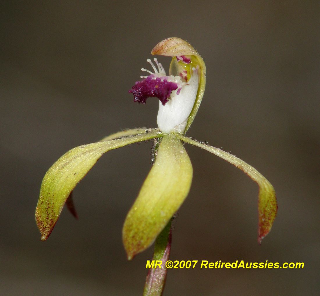 A miniature sized, cold growing terrestrial from eastern Australian at elevations of 400 to 800 meters occuring in open forest with open heathy under-story mainly in granite-based loamy soil with a single, thin leaf that blooms in the spring on an erect, to 3.2 to 8" [8 to 20 cm] long, 1 to 4 flowered inflorescence carrying honey scented flowers.