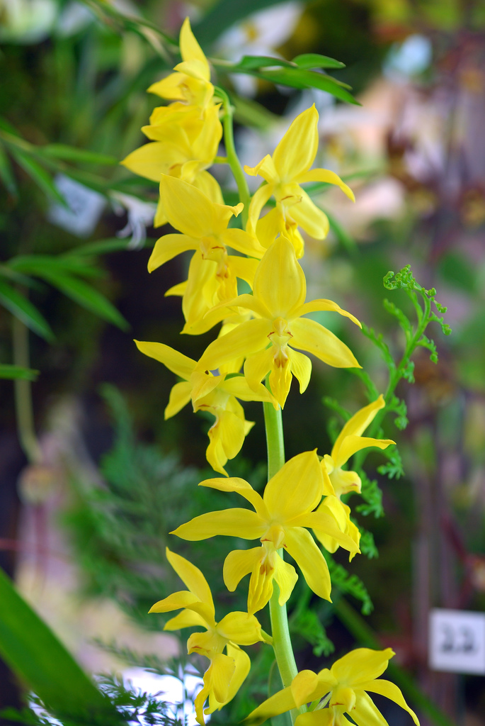 A beautiful terrestrial with 2 to 3 broad elliptic 8" evergreen leaves per growth, 18" spikes emerge from the center of the new growths carrying up to 20 bright yellow flowers, the 2" blooms are well-rounded and fully shaped, early spring bloomer, strong lemony fragrance. Found in Taiwan as a cool to cold growing terrestial that blooms in the spring.