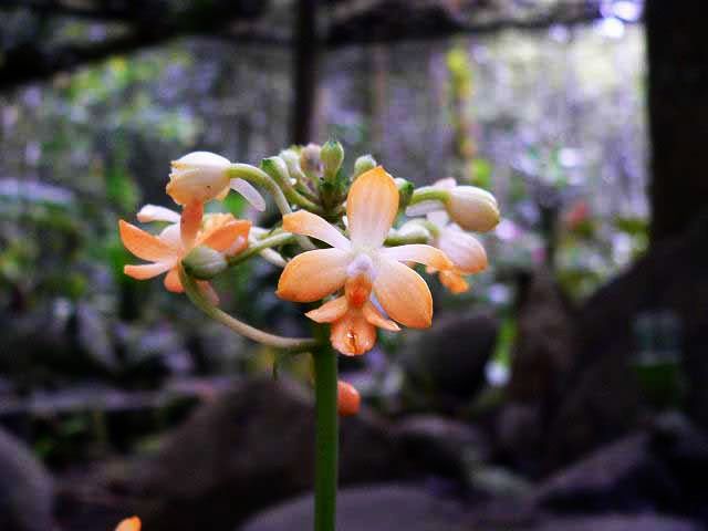 Found in Borneo near Mount Kinabalu in lower montane oak/laurel, rarely hill forests at elevation of 900 to 2100 meters as a small sized, warm to cold growing terrestrial orchid with a few to several, plicate, elliptic, acute, gradually narrowing below into the petiolate base leaves that blooms in the summer in situ on an erect, peduncle to 30" [75 cm] long, provided with several tubular sheathing bracts, rachis to 4" [10 cm] long, finely pubescent, overall 34" [85 cm] long, several to many flowered inflorescence with deciduous as the flowers open, lanceolate, acuminate, reflexed, spreading floral bracts and holding the orange yellow flowers towards the apex.