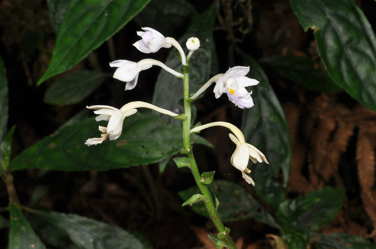 Found on Luzon in the Philippines in mossy forests along trails at elevations of 1000 to 2500 meters as a small sized, cool to cold growing terrestrial with a short stem carrying 4 to 5, narrowly lanceolate, plicate, basally clasping leaves taht blooms in the winter on an erect, to 16" [40 cm] long, wooly hairy, with persistent, closely adpressed bracts, rachis many flowered inflorescence carrying white, odorless flowers with a purplish lip.