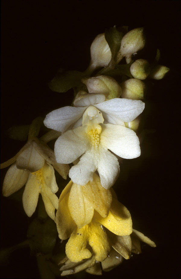 Found in Sumatra lowland and hill forests on alluvial soils at elevations of 300 to 400 meters as a medium to large sized, hot growing terrestrial with obscure pseudobulbs carrying 5 to 6, narrowly elliptic-lanceolate, acuminate, glabrous, gradually narrowing below into the channeled petiolate base leaves that blooms in the later spring and early summer on an erect, slender, puberulous, rachis .8 to 6.4" [2 to 16 cm] long, overall to 24" [60 cm] long, 5 to 30 flowered inflorescence with recurved, elliptic-ovate, shortly apiculate to acuminate, pubescent, persistent floral bracts carrying wide spread flowers that turn orange with age.