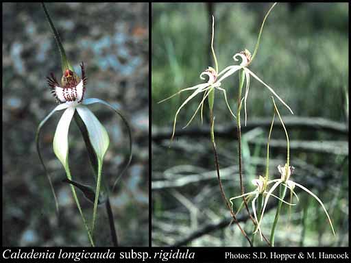 References W3 Tropicos, Kew Monocot list , IPNI ; Native Orchids of Australia Jones 2006 as Arachnorchis longicauda subsp. rigidula photo good;