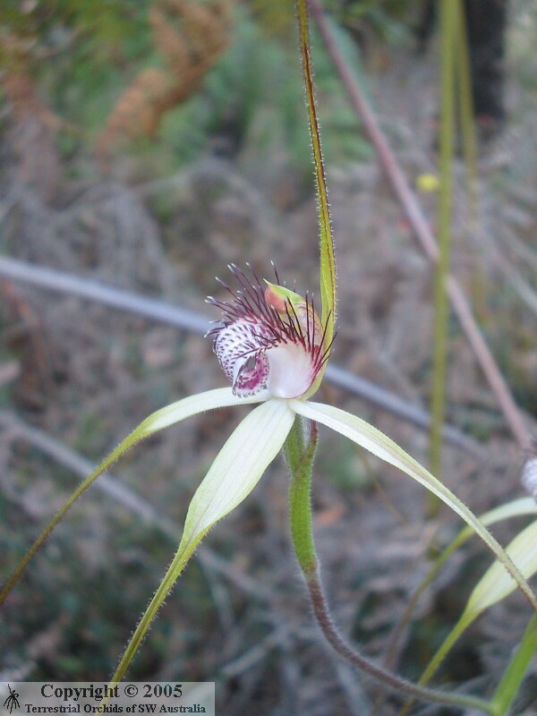 Caladenia longicauda subsp. clivicola Hopper & A.P.Br. 2001 SUBGENUS Calonemorchis Photo by Terrestrial Orchids of South-West Australia Website