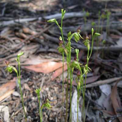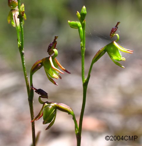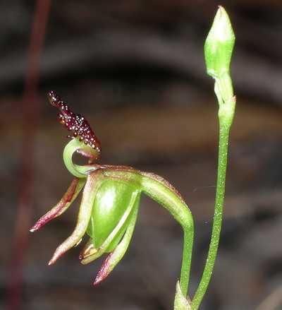 This miniature sized, cold growing terrestrial species is from Queensland, New South Wales, Victoria, Tasmania and South Australia at elevations of 20 to 1000 meters occuring often in sandy, white pebble type soils at base of trees with an erect, reddish stem carrying a narrowly linear, acute, basally clasping leaf and and blooms in the spring and summer on an erect, 2.4 to 7.2" [6 to 18 cm] long, successively 2 to 4 flowered inflorescence. The beak-like labellum is covered with dark purple shiny glands and snaps shut when touched and is pollinated by the male sawfly.