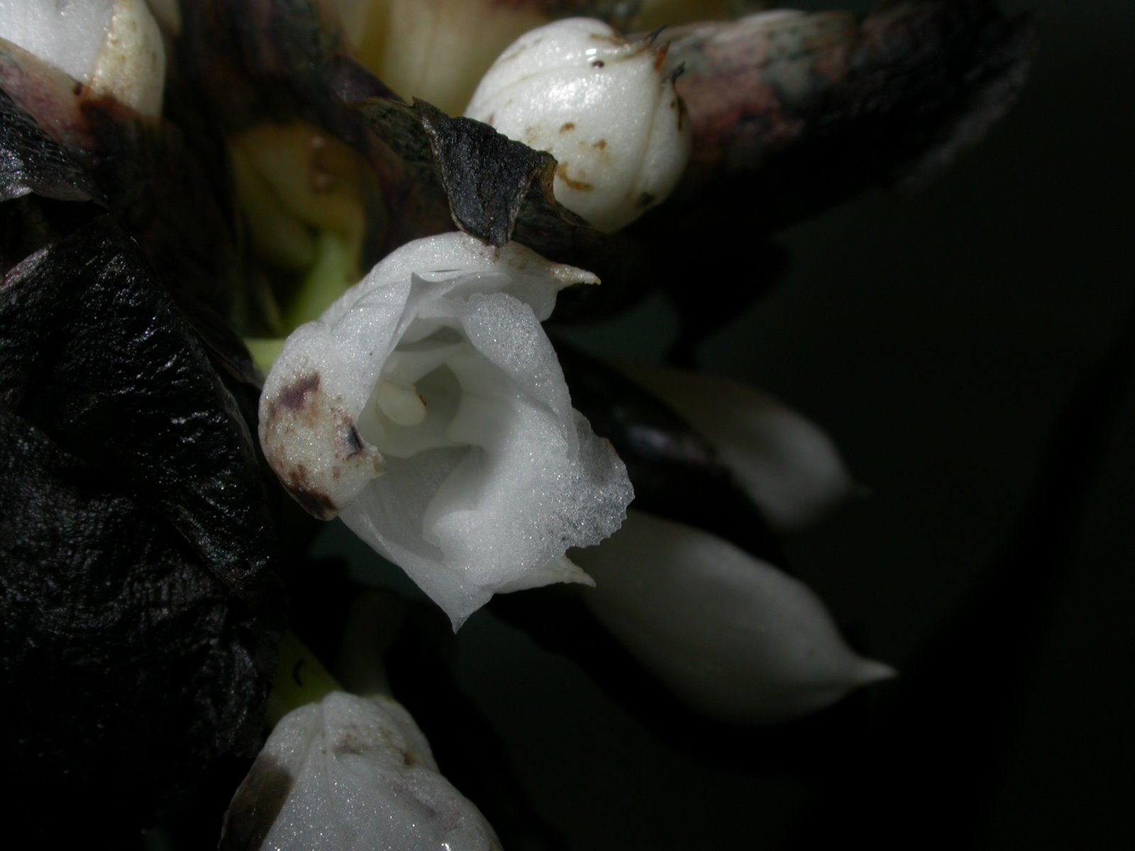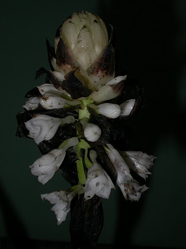 Found on Mt Kemiri Sumatra in montane forests on decaying tree trunks or in deep leaf mold on the forests floor at elevations of 1000 to 2000 meters as a medium sized, warm to cool growing terrestrial with a creping rhizome giving rise to partially hidden, swollen, green pseudobulbs carrying plicate, "V" shaped, lanceolate, acute, gradually narrowing below into the petiolate base leavesthat are held in a loose spiral blooming in the late summer and early fall on a lateral, robust, erect, glabrous, stout, rachis gradually extending, densely to 50 flowered inflorescence with ovate, acute, persistent, white becoming black floral bracts and carrying non-resupinate flowers that do not open fully.