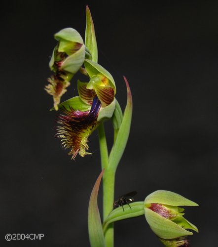 A small sized, cold growing terrestrial from eastern Australian and New Zealand occuring in open forest and heathland in moist to well-drained soils at elevations of sea level to 500 meters with a robust stem with 1 to 3, green to copper colored, lanceolate, clasping stem bracts carrying a basal, single, large, deeply channeled, thick, triangular in cross section, leaf that flowers in the spring and early summer on a 24" [60 cm] long, robust, 7 to 15 flowered inflorescence with 2 triangular floral bractsbracts.