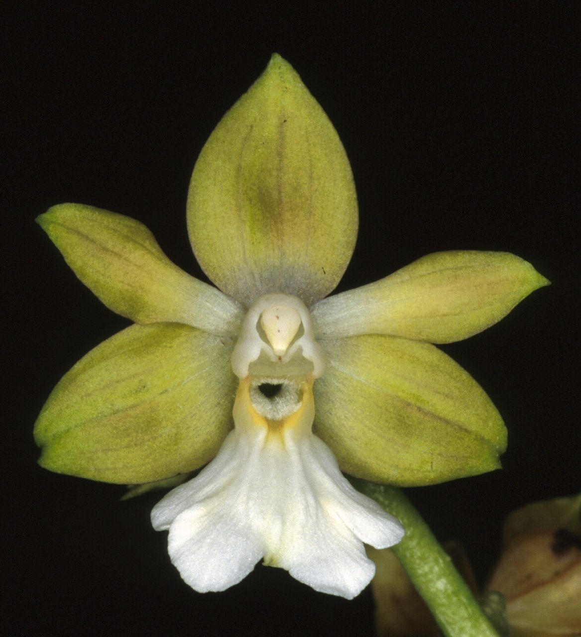 Found in western Himalayas, eastern Himalayas, Nepal, Bhutan, Sikkim and Yunnan and Xizang Province of China in evergrgeen broad-leaved forests at elevations of 1800 to 2500 meters as a medium sized, cool to cold growing terrestrial with conical pseudobulbs carrying 3, elliptic-ovate, plicate, prominently ridged, acute, narrowing below into the petiolate bsae leaves that arise with the leaves in late winter and early spring on a lateral, laxly to subdensely many flowered, ridged, puberulent, 10 to 14.4" [25 to 36 cm] long, racemose inflorescence with persistent, lanceolate floral bracts and carrying fragrant, pendant flowers