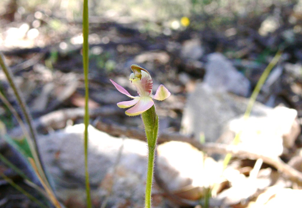 Found in Victoria and Tasmania in coastal scrub and in heathy forests at elevations of sealevel to 50 meters as a miniature to small sized, cold growing terrestrial with a thin, linear, hairy, basally red leaf that blooms in the spring on an erect, 4.8 to 9.6" [12 to 24 cm] long, 1 to 2 flowered inflorescence.