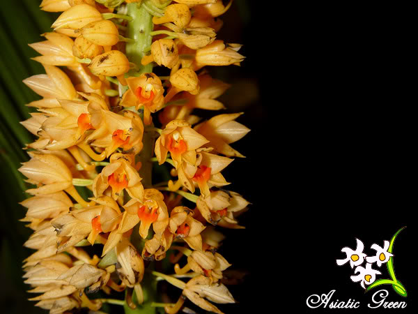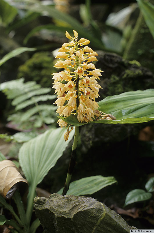 Found in Laos, Thailand, Borneo, Java, Malaysia, the Philippines and Sumatra in humid forests on decaying tree trunks and in deep leaf mold on the forest floor at elevations of 120 to 1700 meters as a medium to large sized, hot to cool growing terrestrial with close set, small pseudobulbs enveloped by leaf sheaths and carrying 5 to 6, elliptic, acuminate, plicate, gradually narrowing below into the elongate petiolate base leaf that blooms in the spring on a 20 to 24" [50 to 60 cm] long, erect, hairless, densely 40 to 110 flowered, racemose inflorescence with large, lanceolate, acute, very concave floral bracts that fall before the odorless flowers open