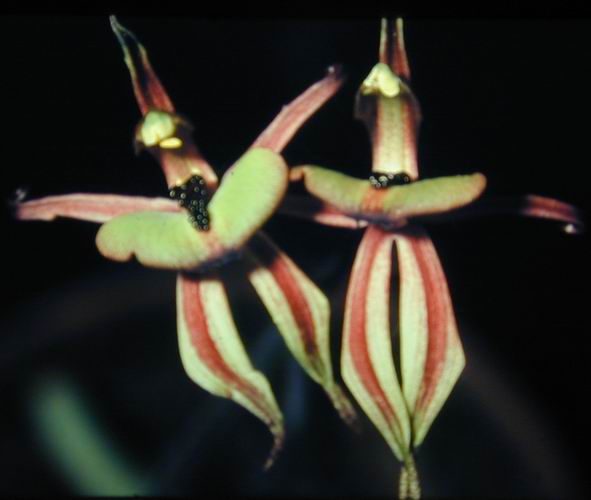 Found in Western Australia at elevations of 100 to 400 meters in shrublands, mallee vegetation, granite outcrops and sandplain heath as a miniature to small sized, cold growing terrestrial with a single, basal, pilose, linear leaf that blooms in the late winter and earlier spring on an erect, 4.8 to 12" [12 to 30 cm] long, 1 to 3 flowered inflorescence