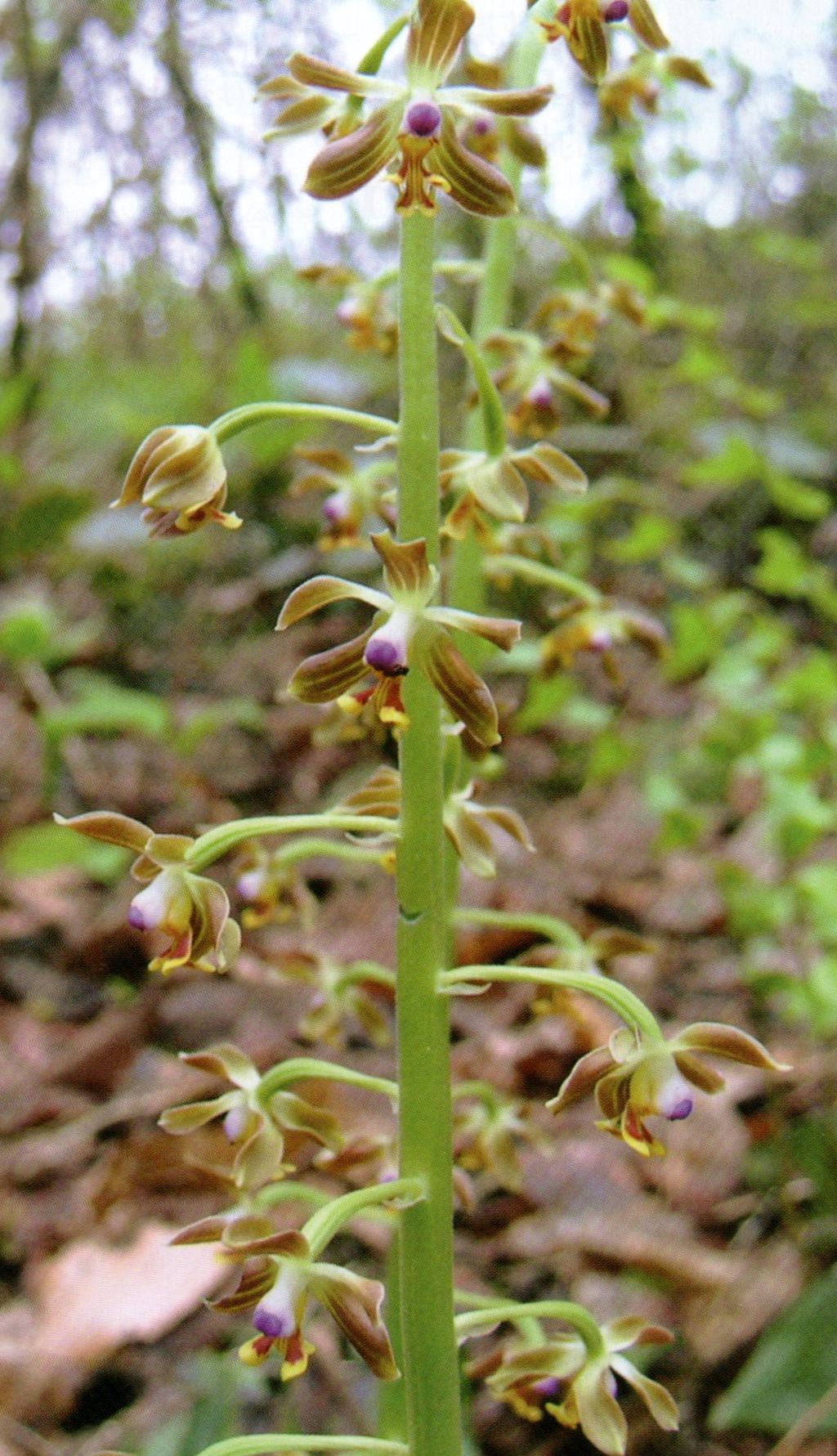 Found in Chongqing and Guizhou provinces of China in forests at eleations around 1800 meters as a small sized, cool growing terrestrial with 3 basal, not deciduous, oval to elliptic glabrous, subacute apically, petiolate base leaves that blooms in the summer on an erect, axillary, provided with 1 to 2 bract-like sheaths, puberrulent, 10 to 12" [25 to 30 cm] long, rachis laxly 4 to 6 flowered inflorescence with persistent, ovate, acuminate floral bracts