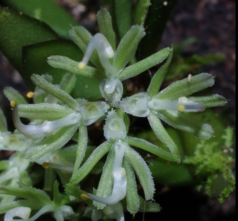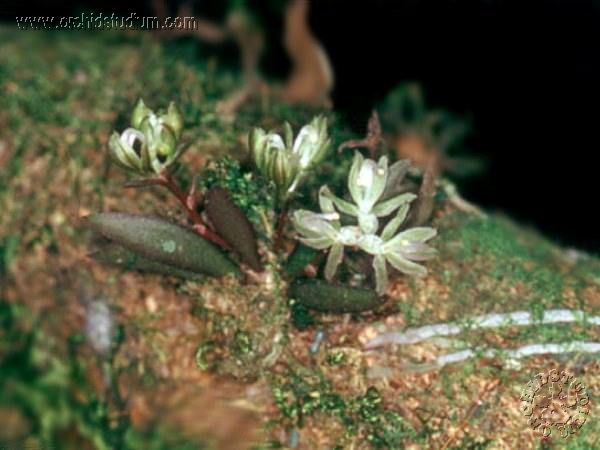 Found in Surinam and Para' State of Brazil in rainforests at elevations around 400 to 500 meters on thin, mossy twigs of trees as a mini-miniature szied, hot to warm growing epiphyte with a very short stem enveloped copmpletely by imbricating, leaf bearing sheaths each carrying, distichously arranged, narrowly elliptic, acute apically, ancipitous leaves that blooms in the spring on an axillary, .8" [2 cm] long, 4 to 5 flowered infloresence with a vaginate, acuminate sheath at the mid-point and narrowly ovate floral bracts.