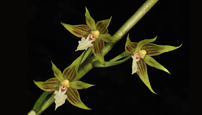 Found in eastern Nepal, Bhutan, India and Myanmar on shady forest floors at elevations of 1830 to 2400 meters as a small to medium sized, cool to cold growing terrestrial with cylindric pseudobulbs carrying 3 to 4, linear-lanceolate, acute, sessile base leaves that blooms in the spring through summer on an erect, puberulous, peduncle to 9.2" [23 cm] long, overall to 16" [to 40 cm] long, loosely 14 to 18 flowered inflorescence with linear-lanceolate, longer or as long as the ovary floral bracts