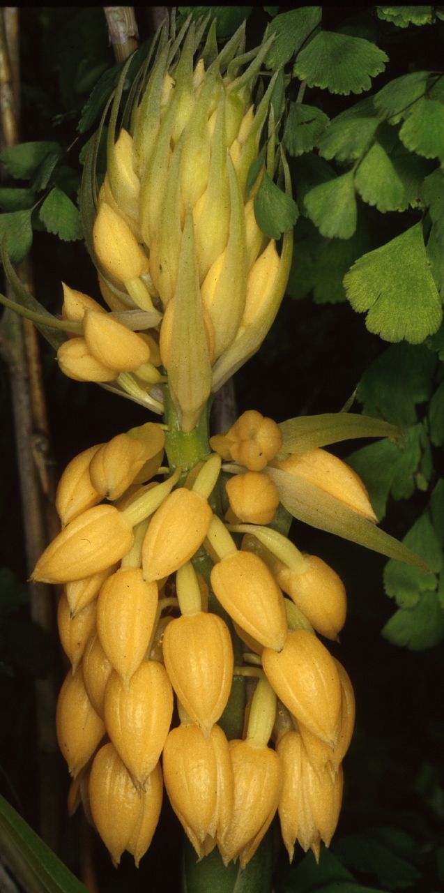 Found in the Moluccas, New Guinea, Solomon Islands, Fiji, New Caledonia, Samoa, Santa Cruz and Vanuatu in cloud forests at elevations of 580 to 1700 meters as a medium to large sized, warm to cool growing terrestrial with clustered, inconspicuous pseudobulbs hidden by the leaf bases of the 4 to 6, plicate, lanceolate, acuminate, gradually narrowing below into the elongate, petiolate base leaf that blooms in the spring through fall on a lateral, from the base of the pseudobulb, erect, peduncle 7.2 to 8.6" [18 to 21 cm] long, rachis 2.4 to 2.8" [6 to 7 cm] long, overall 14 to 26" [35 to 65 cm] long, densely many flowered inflorescence with deciduous, lanceolate, acuminate bracts and drooping flowers.