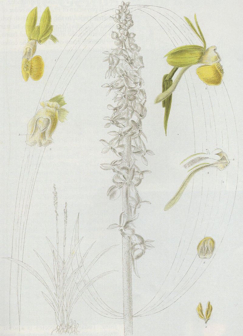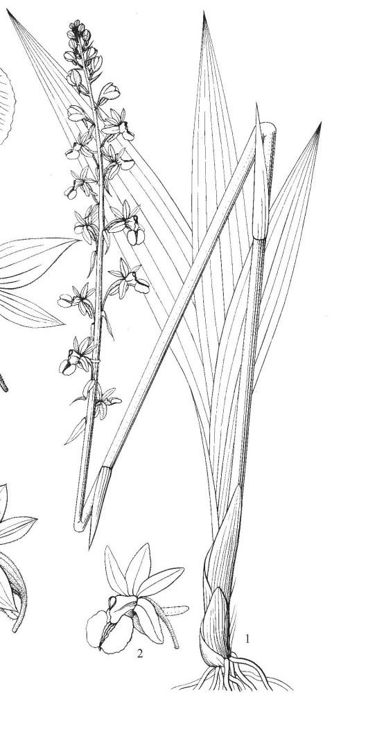 Found in the the eastern Himalayas, Assam, Myanmar and north and south western Sichuan province of China in forests and shrubby slopes at elevations of 1000 to 1800 meters as a large sized, cool growing terrestrial with conic pseudobulbs enveloped by leaf sheaths and carrying usually 3, not well developed at blooming, suberect, not deciduous, ensiform to narrowly oblong-oblanceolate, acute, gradually narrowing below into the petiolate-like, pseudostem base leaves that blooms in the later spring on an erect, axillary, stout, puberulent, to 28" [to 70 cm] long, 10 to 20 flowered inflorescence with 1 to 2, tubular sheaths and persistent, reflexed, narrowly lanceolate, sparsely puberulent floral bracts.