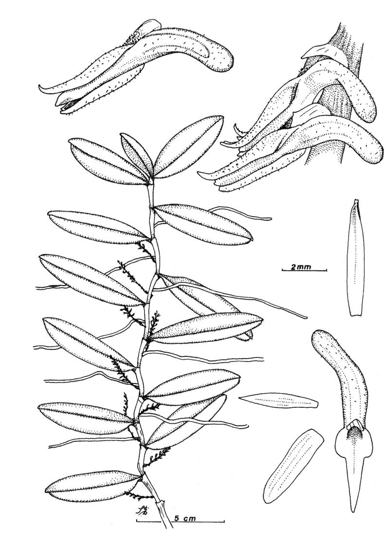 Found in Los Rios Ecuador as a medium sized, hot growing epiphyte with a thin stem enveloped completely by imbricating conduplicate sheaths carrying deciduous, numerous, distichous, patent, glabrous, narrowly oblong-elliptic, obtuse apically, narrowing below into the sessile base leaves that blooms on a filiform, lateral, racemose, shorter than the leaves, to .12" [3 mm] long, with small white flowers.