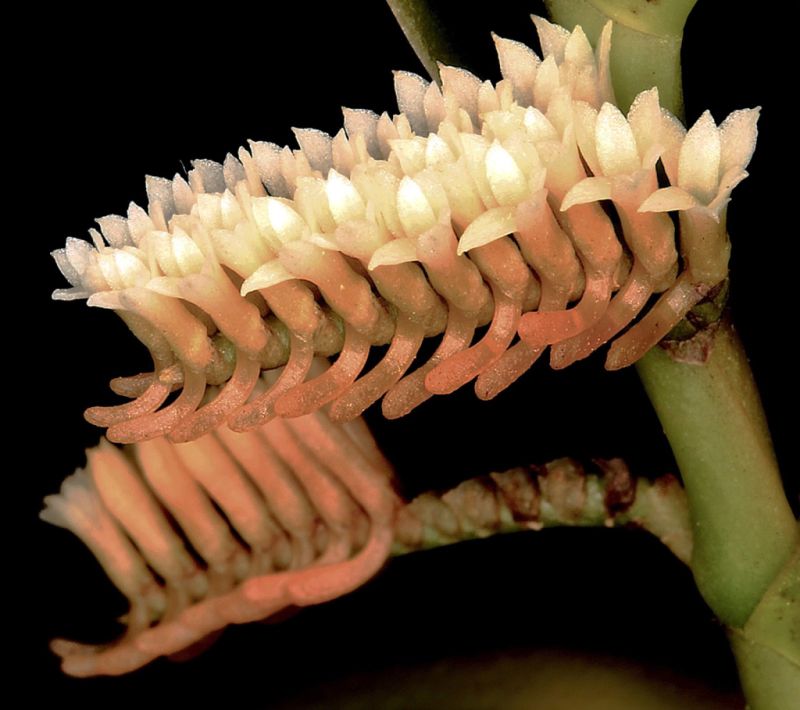Found in Colombia and Ecuador at elevations around 70 to 1200 meters as a small sized, hot to cool growing epiphyte with an elongate, flexuous, glabrous stem carrying erect-patent, oblong to ligulate-oblong, unequally obtuse to obtusely bilobed apically leaves that blooms on a lateral, racemose, .6 to 1.2" [1.5 to 3 cm] long, densely many flowered, secund inflorescence with triangular-ovate, apiculate floral bracts.