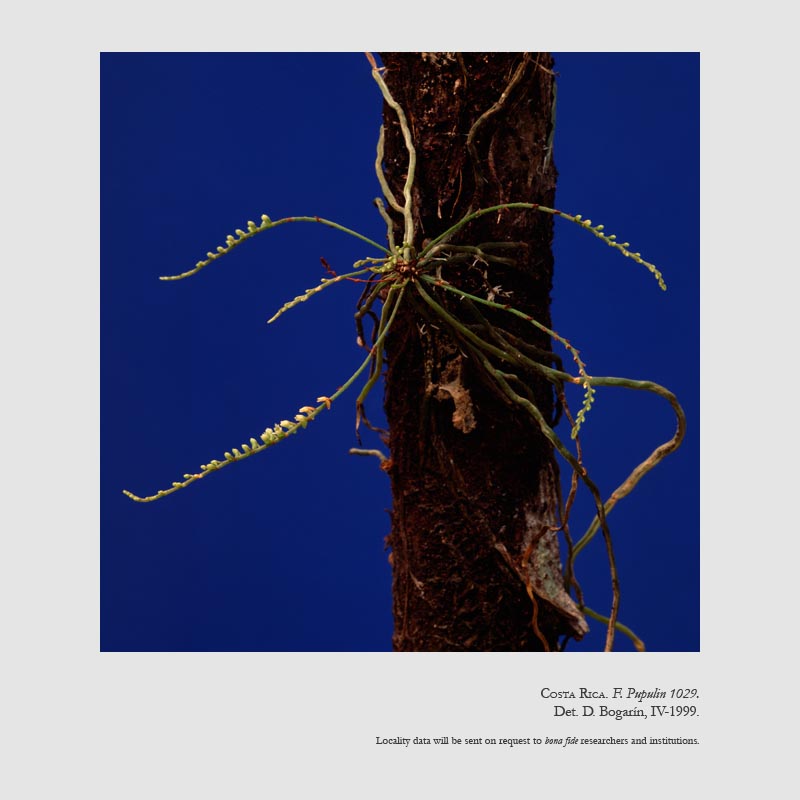 Found in Costa Rica at elevations around 500 meters as a small sized, erect to pendant, hot to warm growing epiphyte with elongate roots and no leaves that blooms in the winter on an erect to suberect, to 2.8" [7 cm] long, densely many flowered inflorescence with glabrous, triangular, acute floral bracts.