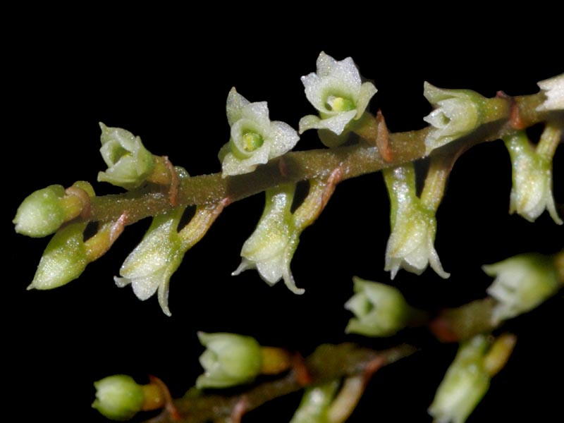 Found in the western everglades in Florida, Cuba, Dominican Republic, Haiti, Jamaica, Puerto Rico, Trinidad & Tobago, Mexico, Guatemala, Costa Rica, Panama, French Guyana, Surinam, Guyana, Venezuela, Ecuador and Brazil in moist montane forests as a leafless, monopodial, hot to cool growing epiphyte at elevations of sea level to 1400 meters that bloom in the late winter and spring with an erect, to 1 1/2" [3.75 cm] long, densely many flowered inflorescence with prominent reddish brown bracts giving rise to inverted, 2 ranked flowers appearing on both sides of the rachis, that arise from the center of the root ball.