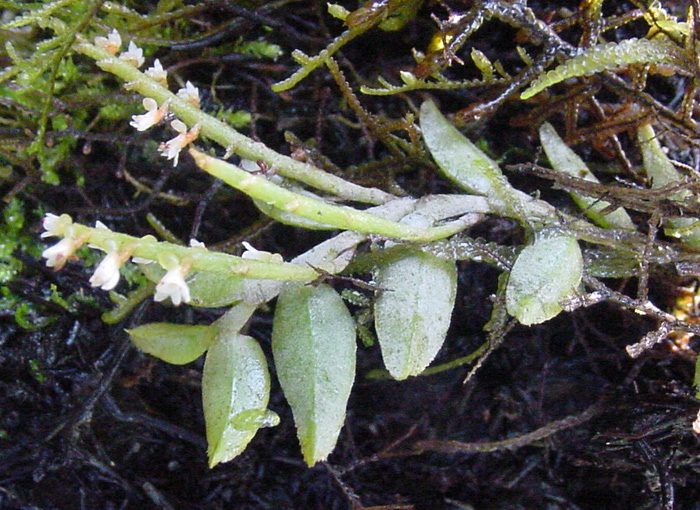 Found in Colombia, Ecuador and Peru in wet montane cloud forests at elevations around 1500 to 1800 meters as a miniature to small sized, cool growing, leafy, mat-forming epiphyte with an elongate, creeping, branching stem carrying distichous, stiff, somewhat serrate towards the apex, narrowly ovate, apiculate, slightly contracted below into the sessile base leaves that blooms in the summer and fall on longer than the leaves, opposite the leaves, 1" [2.5 cm] long, distichous, many flowered inflorescence.