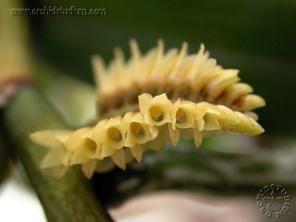 Found in Peru and Brazil as a leafy epiphyte that blooms in the spring and fall on 1 to several, short inflorescence.