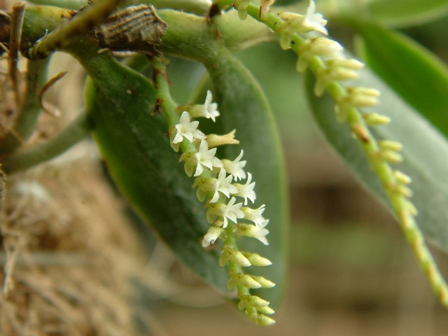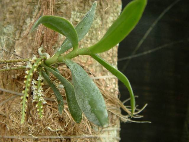 Found in Mexico, Belize, Guatemala, El Salvador, Honduras, Nicaragua and Costa Rica at elevations of 900 to 1500 meters as a miniature sized, warm to cool growing epiphyte with roots that are about 12" [30 cm] long, and a monopodial, short, slightly fractiflex stem enveloped by clasping, leaf bearing sheaths each carrying a coriaceous, distichous, obliquely bilobed apically and gradually narrowing below and articulate to the clasping sheaths that blooms in the spring and summer on several axillary, arising from the leaf axils below the roots, 1 to 1.2" [2.5 to 3 cm] long, many flowered, racemose inflorescence with sometimes several arising from the same location.