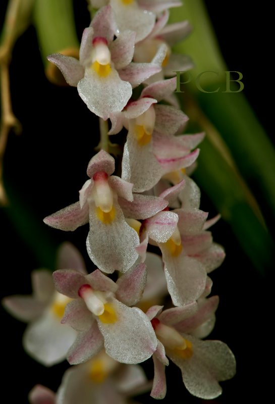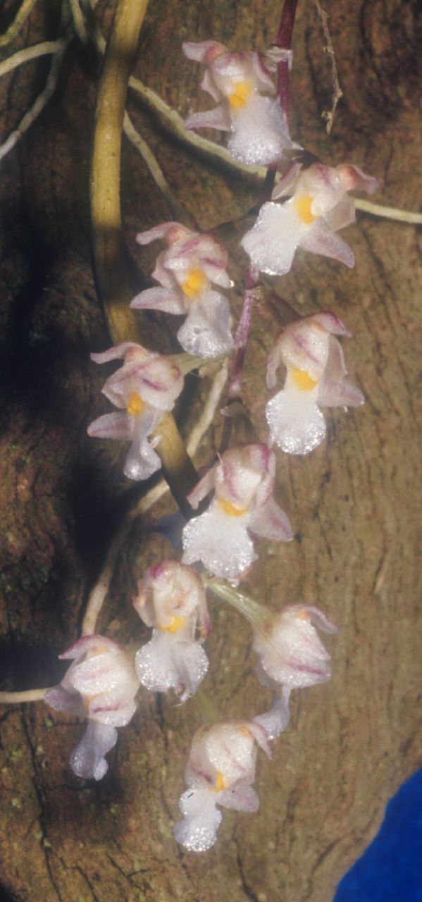 Found in Espirito Santo state of Brazil southward to northern Argentina on lichen and mossy, thin, tree trunks and twigs at elevations around 500 meters as a mini-miniature sized, warm to cool growing epiphyte with small, elongate, attenuate, clustered pseudobulbs covered with papery bracts carrying a single, apical, cylindrical, acute, fleshy, sulcate and channeled above leaves that blooms in the fall on a suberect to pendulous, densely few to many flowered, 1 5/8" to 2 3/4" [4 to 7 cm] long inflorescence carrying minute flowers.