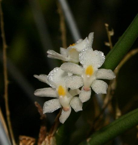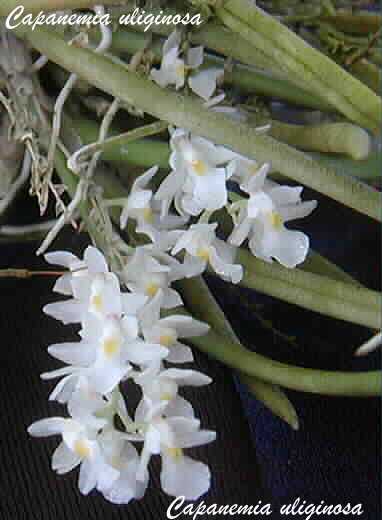 Found in Minas Gerais and Rio de Janiero States of Brazil in wet montane forests on trees near streams as a miniature sized, warm to cool growing epiphyte with minute, linear-oblong, slightly laterally compressed, smooth in youth and longitudinally sulcate with age pseudobulbs enveloped basally by a few membraneous, narrowly triangular, scarious, acute sheaths carrying a single, apical, erct to ascending, terete, bright green, slightly coriaceous, stiff, curved, channeled above, acute leaf that blooms in the spring on a basal, pendant to ascending, slender, thread-like, several to many flowered inflorescence.