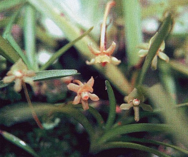 Found in Tanzania and Malawi in montane and submontane forests on shrubs with lichen at elevations of 1800 to 2500 meters as a miniature sized, cool to cold growing epiphyte with an erect stem carrying in two rows, spreading, falcate, linear, unequally bilobed apically leaves that blooms in the fall on 1 to 4, basal, lateral, peduncle .4 to 1" [1 to 2.5 cm] long, with ovate to obovate bracts, 1.2 to 1.6" [3 to 4 cm] long, overall, 1 to 2 flowered inflorescence carrying pale green to ochreous orange flowers.