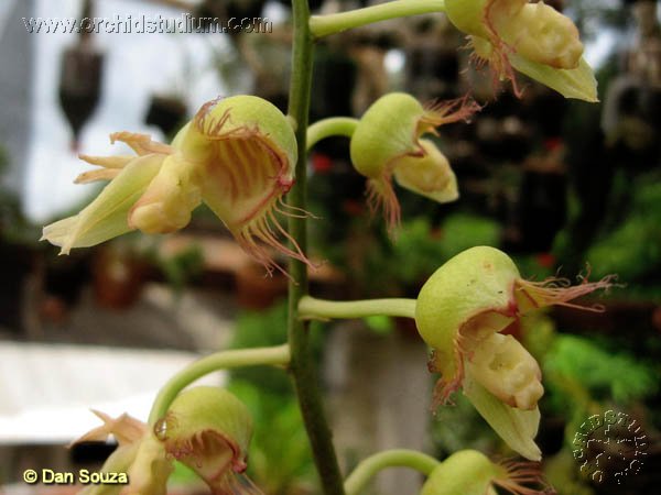 Found in inland South America from Colombia, Venezuela, Guyana, Surinam, French Guiana and northern and eastern Brazil in sandy soil between tufts of grass and under bushes and low trees near gallery forests at 500 to 1100 meters as a large sized, warm growing terrestrial, epiphyte or occasional lithophytewith ovoid to narrowly ovoid-fusiform, 2 to 3 noded pseudobulbs that become heavily ridged with age and enveloped basally by several leaf bearing sheaths carrying 6 to 7, plicate, petiolate, linear-lanceolate, acute, deciduous leaves that blooms in the late fall, winter to early spring on an erect to arcuate, 1 1/2' [45 cm] long, densely several to many flowered inflorescence carrying fragrant rye bread scenteed , fleshy, non-resupinate flowers on a mature pseudobulb that is still leafy or not.