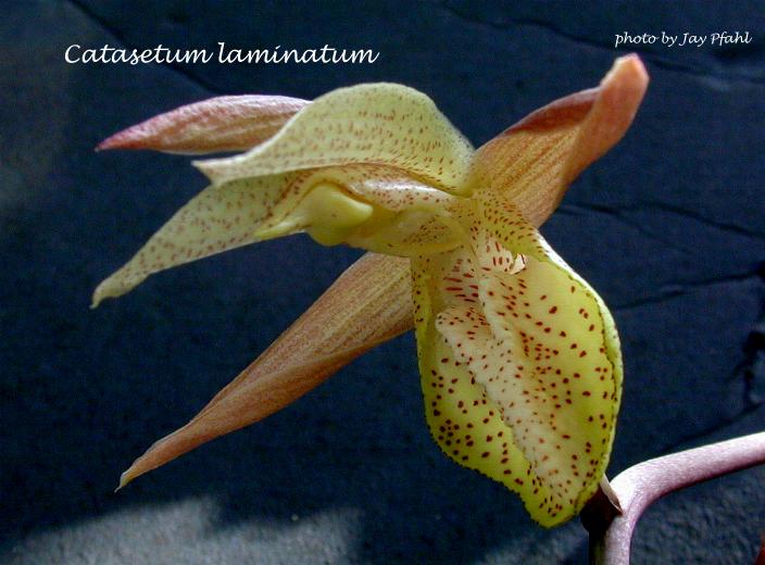 Synonyms Catasetum lamilatum Beer ?; Catasetum laminatum var. eburneum Lindl. 1840; Catasetum laminatum var. maculatum Lindl. 1840