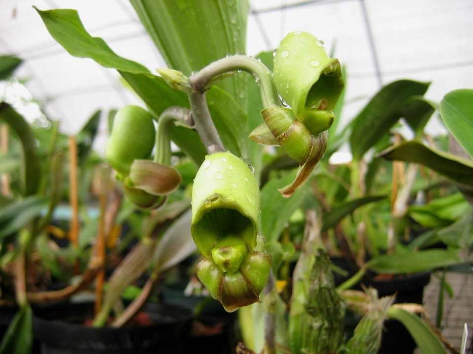 This is a medium sized, hot to warm growing, Mexican, epiphytic species found at medium altitudes in deciduous forests and at lower elevations in deciduous jungle that blooms in the summer on a basal or lateral [from within a brown leaf sheath], erect, several flowered, racemose inflorescence arising on a newly forming pseudobulb