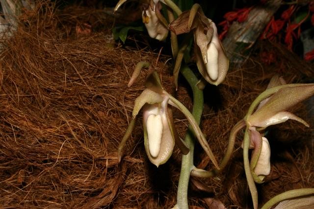Found in Colombia and Brazil in tropical rainforest, riverine swamps and jungle where it grows warm to cool at elevations around 1000 meters as a medium sized, epiphytic species that blooms in the late spring and summer on a suberect, basal, 1 1/2' [45 cm] long, few to several [2 to 6] flowered, racemose inflorescence with extremely fragrant, fleshy, flat opening flowers that arises from a newly formed pseudobulb.