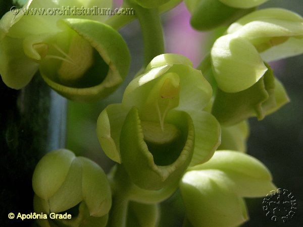 Found in Matto Grosso, Brazil as a medium sized, hot to cool growing epiphyte with clustered, fusiform pseudobulbs enveloped basally by a few leaf sheaths and carrying to 4 to 6 oblanceolate, plicate leaves that blooms in the spring on a basal, erect, then horizontal to pendant few flowered inflorescence that arises on a mature pseudobulb.