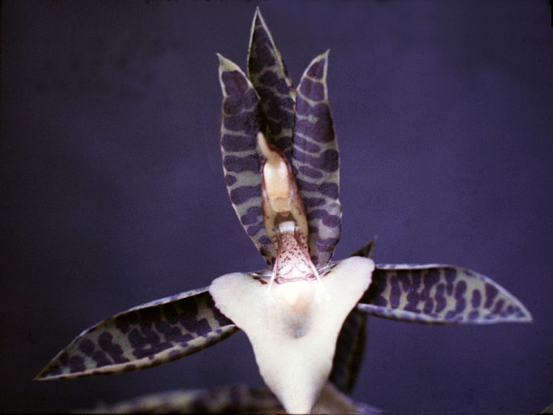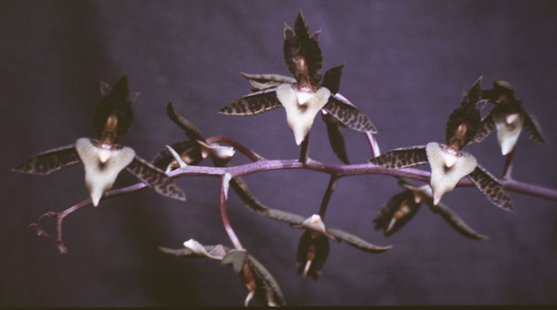Found in Guyana, Fr Guiana, Surinam and Brazil in forests at higher elevations as a medium sized, warm to cool growing epiphyte with oblong-fusiform pseudobulbs carrying deciduous, plicate, many nerved, oblong-lanceolate, acute leaves that blooms in the summer on an erect, green basally grading to maroon towards the apex, 8 to 10 flowered inflorescence