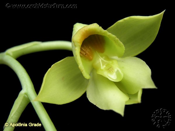 Found in northern Brazil in rain forests at elevations of 90 to 400 meters as a small to medium szied, hot growing epiphyte with clustered, fusiform pseudobulbs enveloped in youth by imbricate, deciduous sheaths and carrying up to 6, plicate, arching, oblanceolate, gradually narrowing below into the pseudopetiolate base leaves that blooms in the summer through early fall on a basal, pendant, racemose, 4.8 to 8.4" [12 to 21 cm] long, to 15 flowered inflorescence carrying small, non-resupinate flowers all held towards the apex.