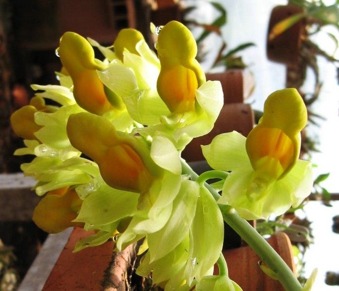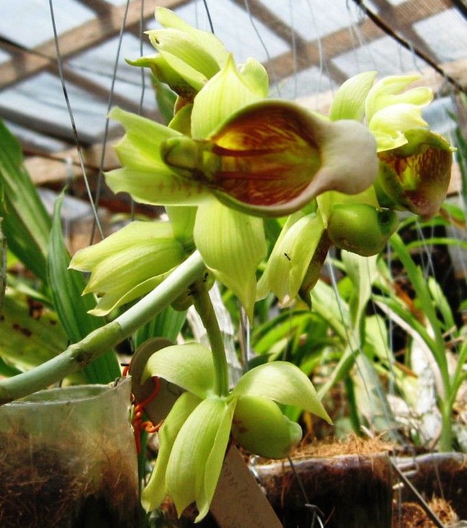 Found in northern Brazil in transitional forests between rainforests and savannah at elevations of 100 to 300 meters as a small sized, hot growing epiphyte with fuisiform to conical, often curved pseudobulbs enveloped completely by leaf sheaths and carrying 6 to 7, oblanceolate, 3 veined, plicate leaves that blooms in the fall to winter on a male, pendant, to 10" [25 cm] long, 7 flowered inflorescence carrying fragrant flowers.