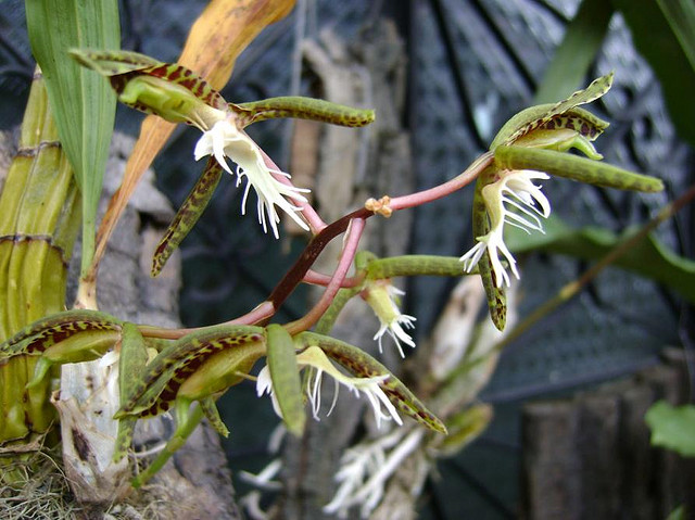 Found in northern Brazil in forests bordering the Amazon River at low elevations as a medium sized, hot growing epiphyte with fusiform pseudobulbs enveloped completely by leafless and leafbearing sheaths carrying up to 8, linear-oblanceolate, medium green, plicate, 3 prominent nerved, basally clasping leaves that blooms in the summer to fall on a male, pendent, to 11.2" [to 28 cm] long, to 30 flowered inflorescence carrying fleshy, fragrant flowers.