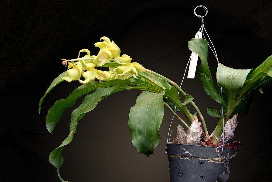 Found in Minas Gerais Brazil in the Atlantic rainforest at elevations around 900 meters as a small sized, warm growing epiphyte with oblong-fusiform, several noded, erect, smooth becoming sulcate and rugose with age pseudobulbs carrying oblong-lanceolate, green, plicate, undulate margins, prominent veined dorsally, clasping base leaves that blooms in the later spring on a male, lateral, arching, to 12" [30 cm] long, 8 to 12 flowered inflorescence.